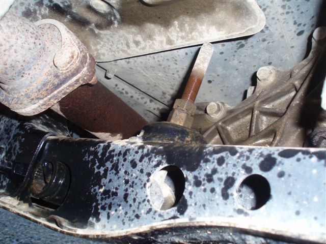 6. Next you will need to give the adjuster a good tap so it slides off the torsion bar spline. You will find that the back of the adjuster has a grove in it which stops it from sliding back as the cross-member locates into this. So you will need to pull the torsion bar down a bit. My torsion bars were original so needed a bit more force to get the adjuster off. I found a smack with a good sized pin punch on the adjuster near the spline did the trick. The adjuster will slide right off and you can pull it right out of the cross-member.