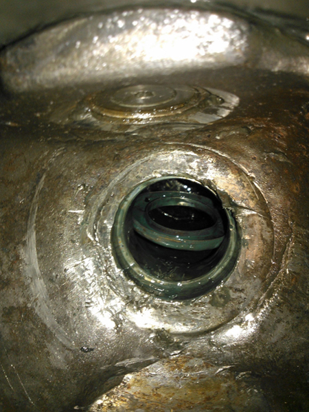 Inboard of the axle housing ball I found what looks like a oil shield loose inside the housing. Note I have removed the oil seal at this point, which took some doing due to the garks, and this part is not part of the seal (much larger in diameter).