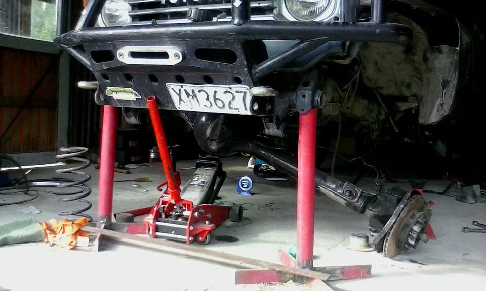 was triangulated with the safari rear, but now runs 80series lowers as uppers and custom lowers with panhard