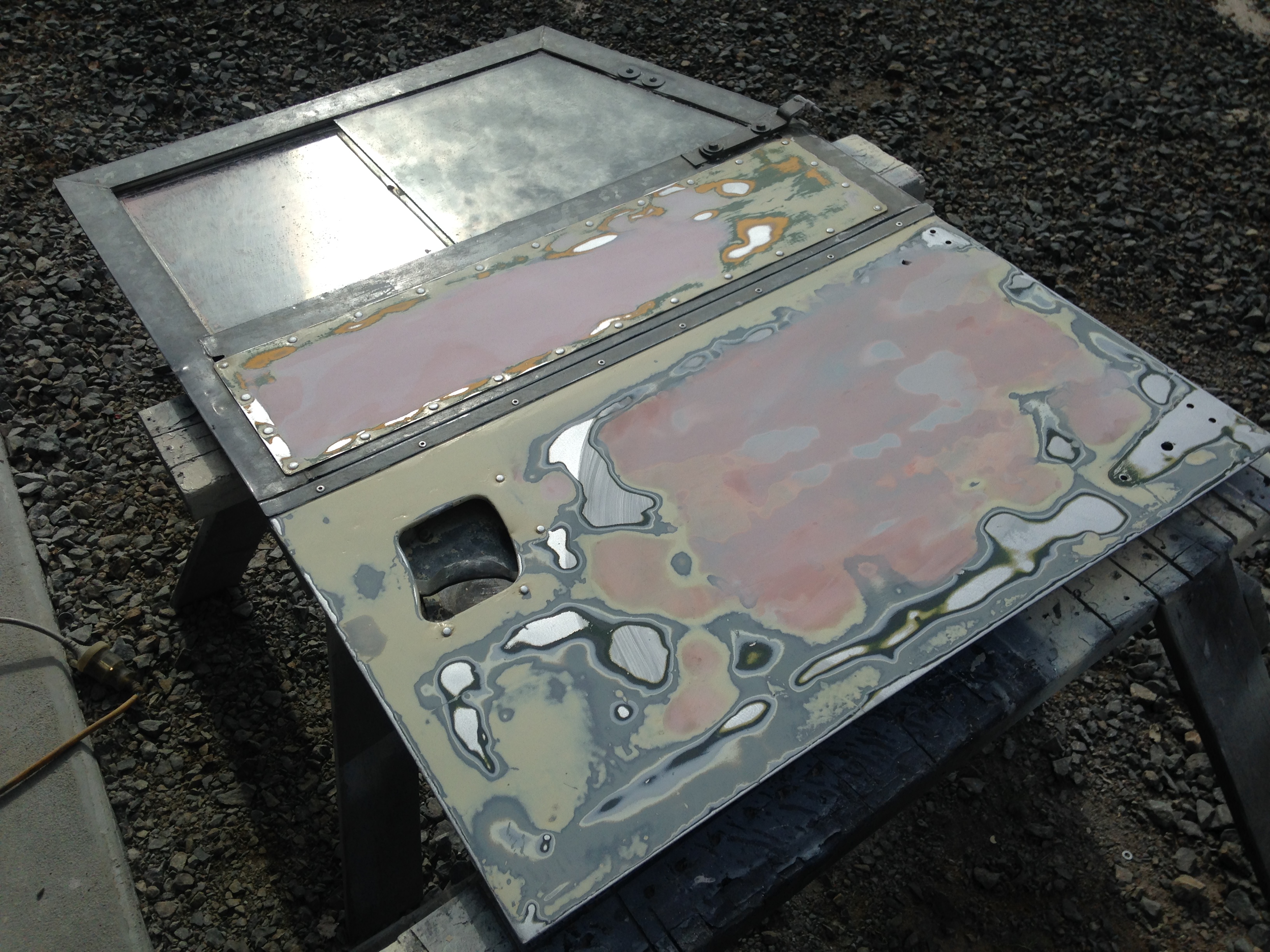 So the experiment is to make a reinforcing plate to go in behind, and urethane it in place to take the spring out of the skin. Most use rivets to hold the reinforcing plate in place until the urethane sets. You them grind the heads off the rivets and job done.