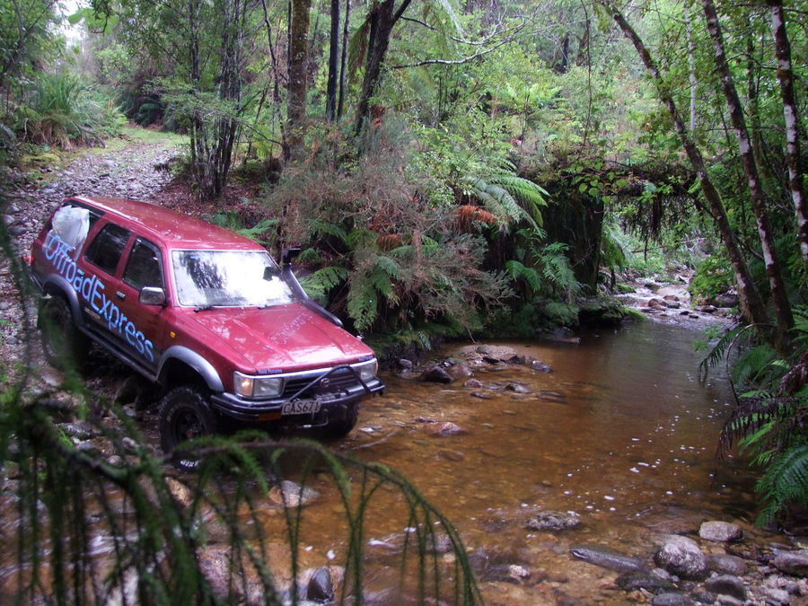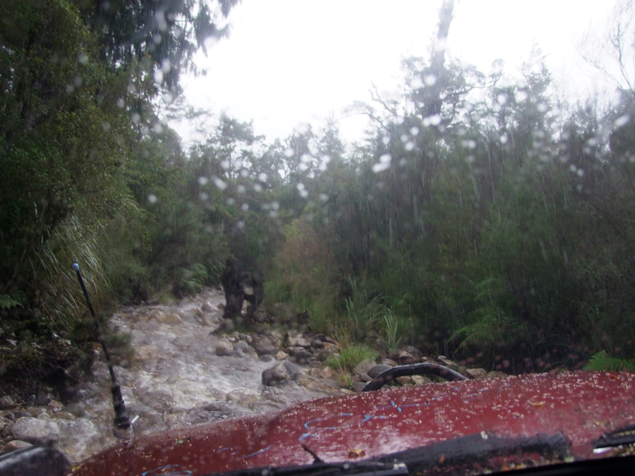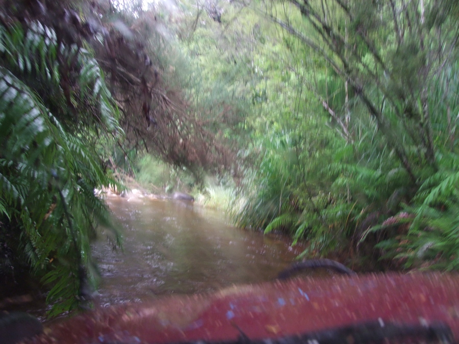 Next up was the big river crossing in the middle of the track. Clearly no one had been through since the last big down pours, as there were big branches (or small trees in wellington terms) blocking the exit and I had to scramble across and clear an exit before even attempting the crossing. Getting to the river was going to prove the biggest challenge as there were some very big rocks/boulders (pebbles to the rock guys) in the way. The surf is locked in the front so you have to take that into consideration when trying to turn sharply in tricky situations. Just off the front wheel was a nice big hole and without solid axle artic the surf will fall into it and not be in a very good position. It was slow going and thank god for auto and left foot braking!