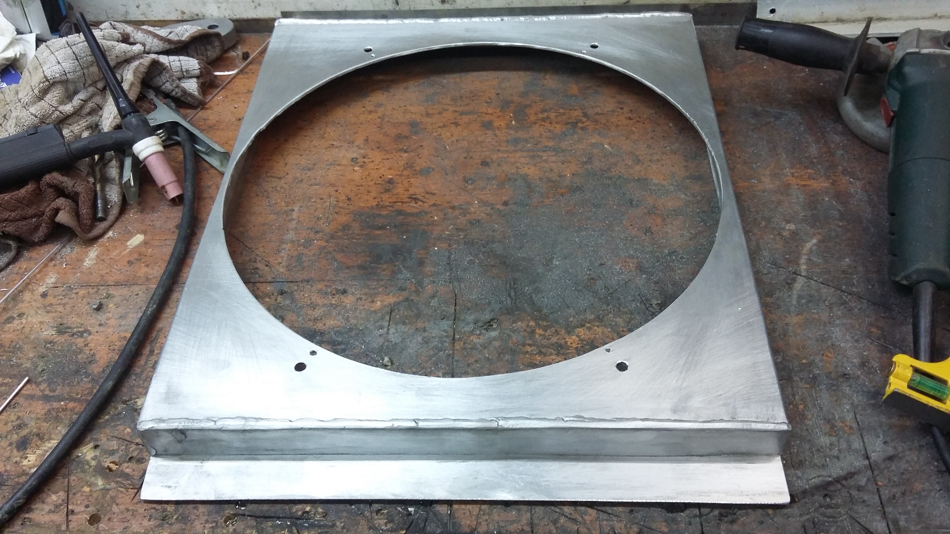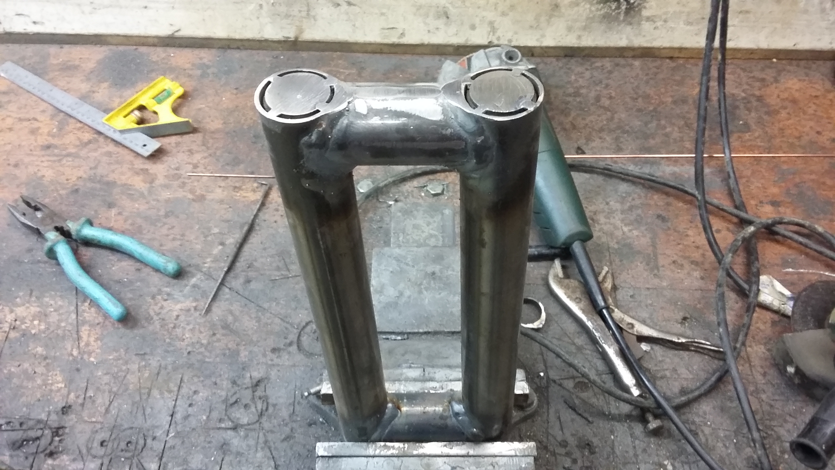 Plumbing in radiator. used 1.5 inch galvanized exhaust tubing. Used my tube former to bend it up.