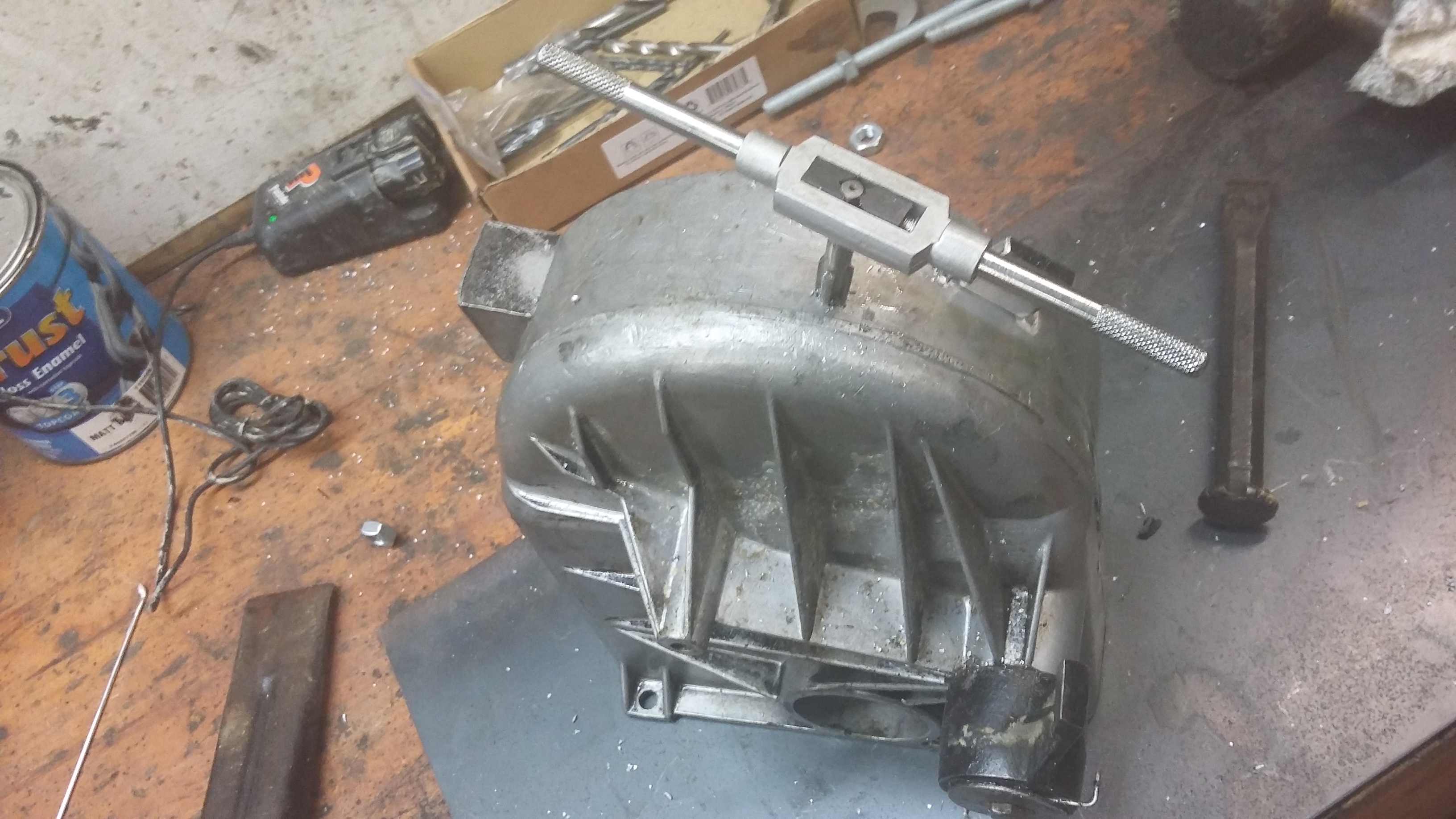 Made a oil reservoir out of the stock can using a bit of 3 inch exhaust tube. Had a high power magnet to strapped to the side to grab any steel filings in the system.