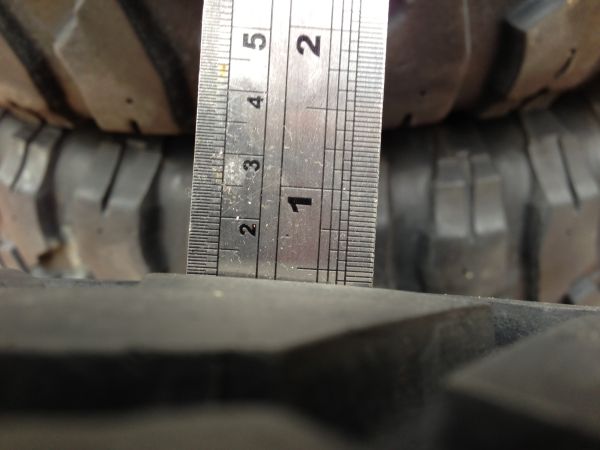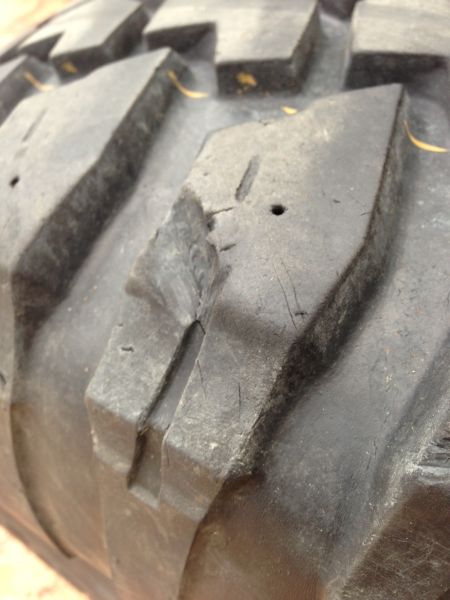 10.5 mm tread remaining (70%, in the middle) and in good condition. There's no side-wall damage, just typical wear and tear on the lugs. A couple of the tread blocks have cuts in them, with a chunk missing (pictured).