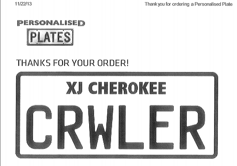XJCrawler wrote:And $959.00 later, the personalized plate is under construction!