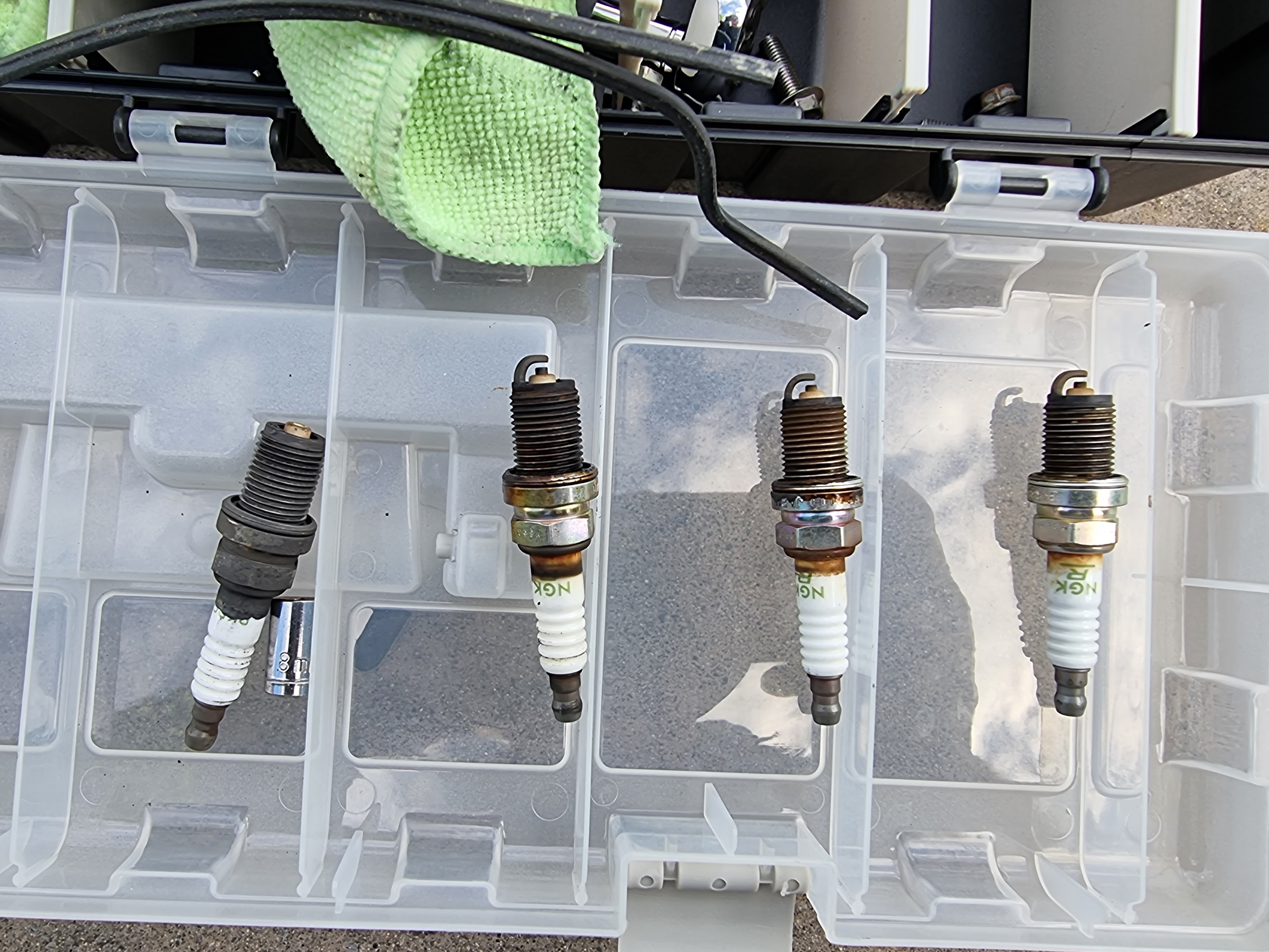 The #4 cylinder has eaten it's spark plug the earth electrode is gone and the center electrode is gone, the spark plug was loose when I removed it and covered in carbon. I haven't removed the engine yet or the head yet so the cause and extent of the damage is unknown at this time. Pictures attached